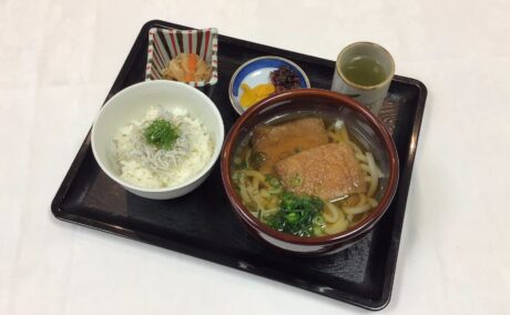 自慢のうどん出しにたくさんの野菜をのせた田辺オリジナルの一品です。